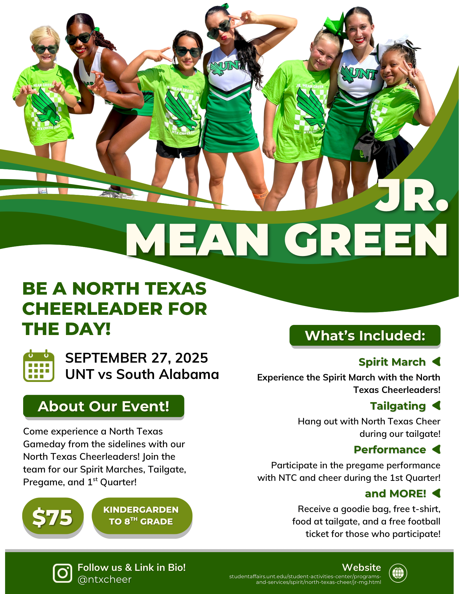 Come be a UNT Cheerleader for a day! Registration will close this Sunday, 9/21! See all the information below and get signed up quick!